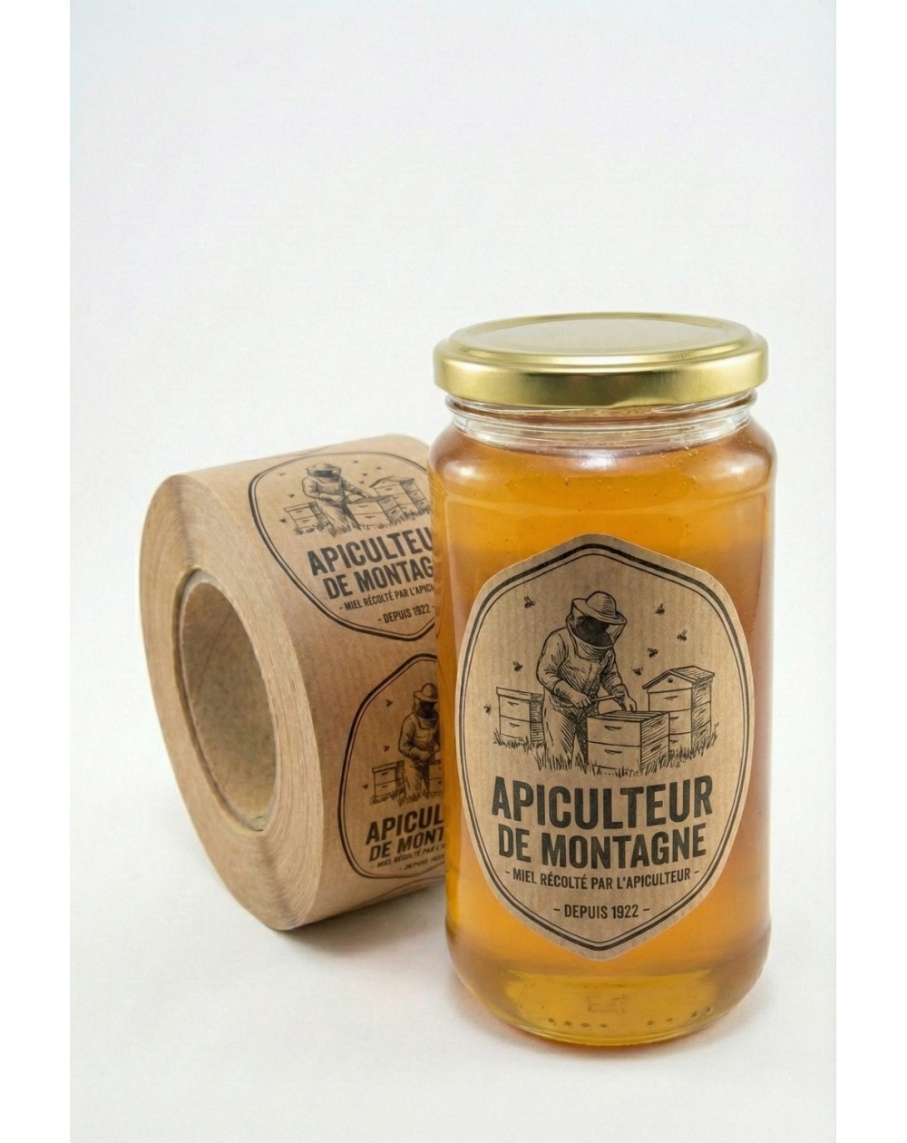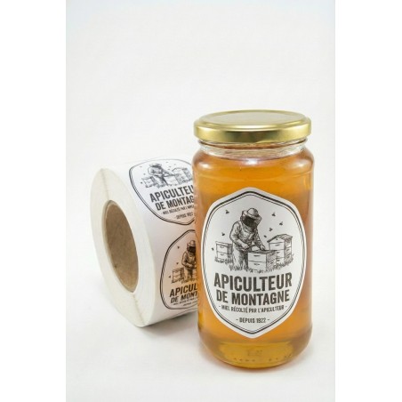 C'est le format de vente standard. Il faut quand même faire attention à ne pas couvrir tout le pot avec votre étiquette. Le client veut voir le miel à travers le verre. Un format 50 × 70 mm ou 60 × 80 mm fonctionne bien.