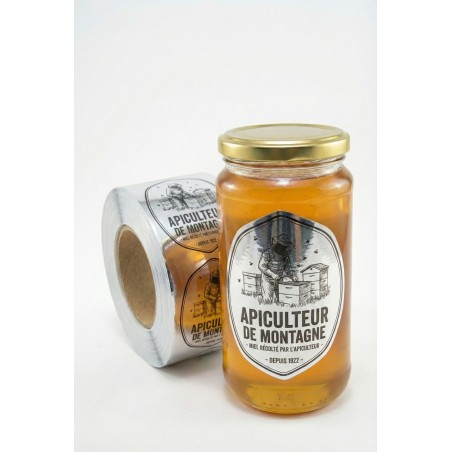 L'idée c'est de laisser voir la couleur du miel à travers l'étiquette. Sur un miel d'acacia bien clair ou un miel de printemps doré, ça met en valeur le produit. Le texte et le logo sont imprimés, le reste est transparent. Comme ça, votre logo ressort bien, et votre miel est bien mis en avant.